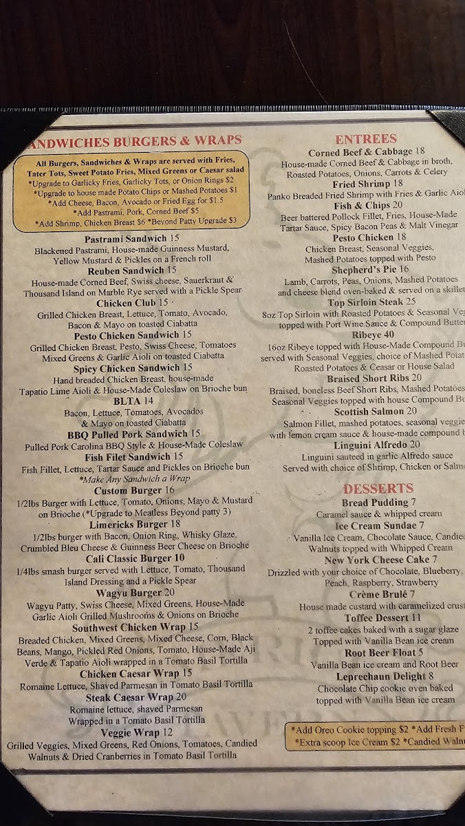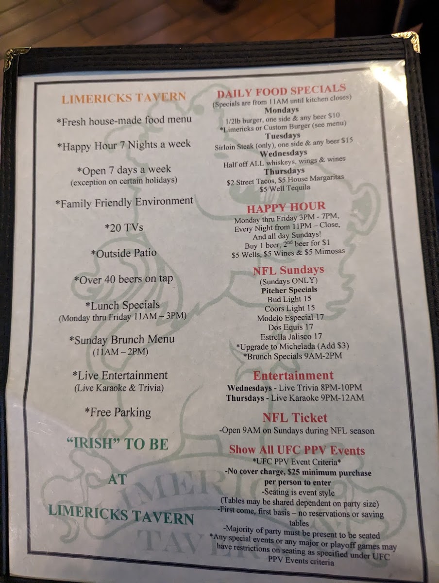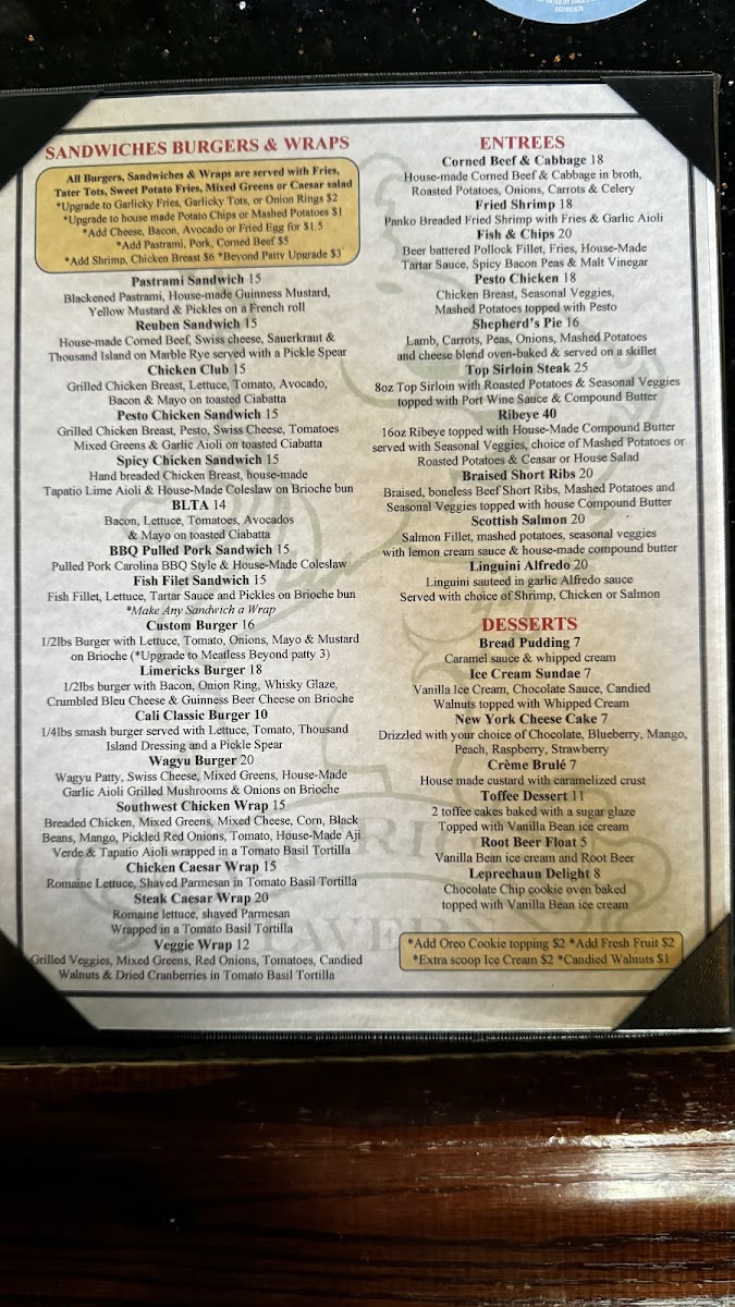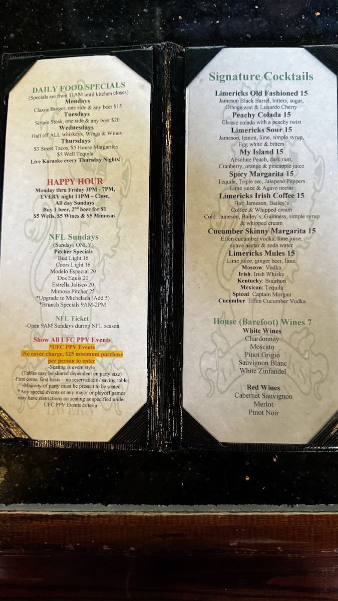 Perfect for casual dining or a lively evening out, Limericks Tavern embodies the spirit of camaraderie and delicious food typical of an Irish pub. With promotional nights like half-off wings and Thursday steak specials, it makes the perfect spot for both a quick bite or a memorable night out. Come for the food, stay for the fun—Limericks Tavern is one culinary experience you won’t want to miss!